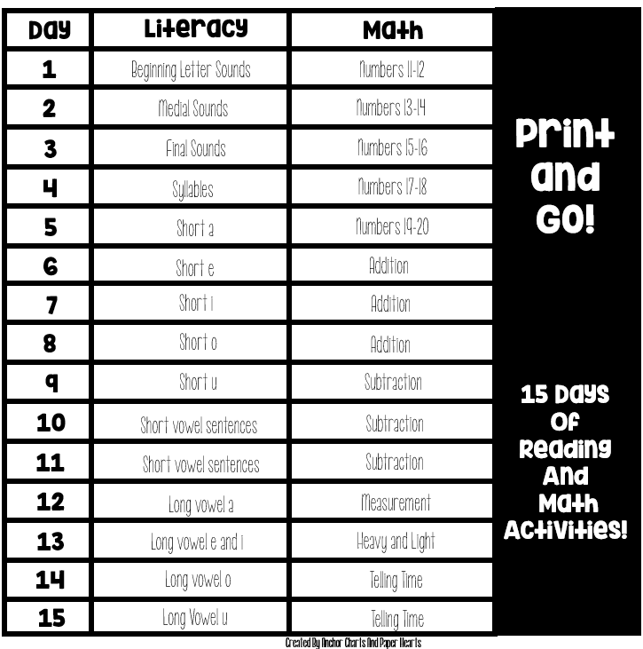 Skills covered include: beginning letter sounds, short vowels (a, e, i, o, u), syllables, short vowel sentences, long vowels, numbers 11‑20, basic addition and subtraction, measurement using non‑standard units, and telling time to the hour and quarter hour.