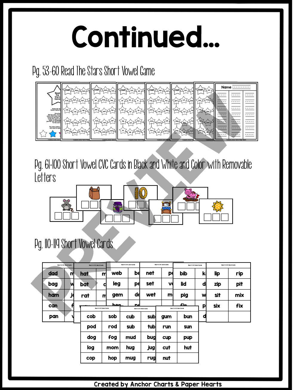 • Anchor charts for short a, e, i, o, u in color and black & white
